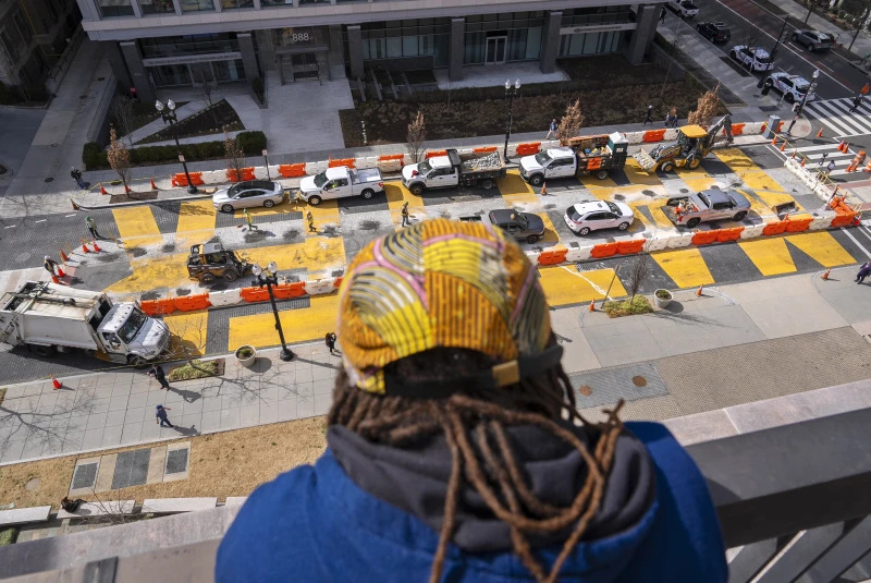 From the top of a building view of the Black Lives Matter mural as demolition beginsAs crews broke up the pavement, D.C. resident Dianne Bradley watched and said, “They can tear up the street, but they can’t erase what happened here.” Keyonna Jones, an artist who helped paint the mural, shared mixed feelings: “It was an honor to be part of this. Art speaks without words.”